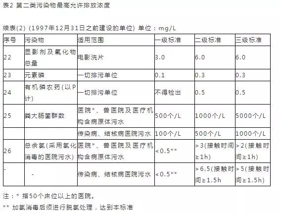2、縣級(jí)及縣級(jí)以上或20張床位及以上的綜合醫(yī)療機(jī)構(gòu)和其他醫(yī)療機(jī)構(gòu)污水排放執(zhí)行表2的規(guī)定。直接或間接排入地表水體和海域的污水執(zhí)行排放標(biāo)準(zhǔn),排入終端已建有正常運(yùn)行城鎮(zhèn)二級(jí)污水處理廠的下水道的污水,執(zhí)行預(yù)處理標(biāo)準(zhǔn)。